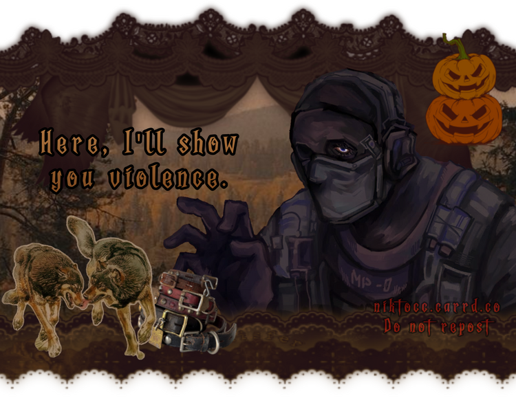 Nikto, Leatherface, Konig, Ghost, Lady Dimitrescu, Captain Price, Soap, Gaz, Roach, Valeria, Frank Woods, Spider punk, Michael Myers, Fnaf rabbits, Lefty, DJ, Glamrock freddy, Monty, Vanessa, Roxy, Eyeless Jack, Ticci Toby, LJ, Slenderman, Huggy Wuggy, Frankie, Shadow rat, 404.